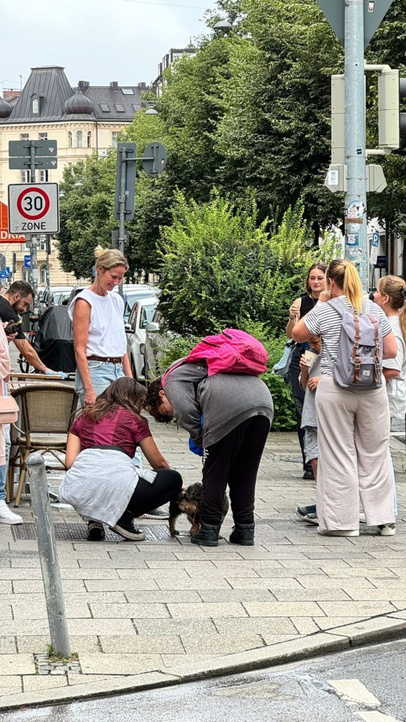 Uscite dal museo alla ricerca di qualcosa di tipico da mangiare, abbiamo avuto occasione di fare un nuovo incontro, mentre attendevamo il momento giusto per attraversare la strada, Francesca e Veronica sono rimaste affascinate da un piccolo cagnolino dolce e peloso, abbiamo così avuto il piacere di conoscere Stephanie, che ci ha raccontato che la vita a Monaco è molto più tranquilla rispetto a quella di Berlino e ci sono pochi ristoranti tipici dove poter mangiare. È una città prevalentemente residenziale, ma le montagne nei dintorni di Monaco attirano molti turisti.
