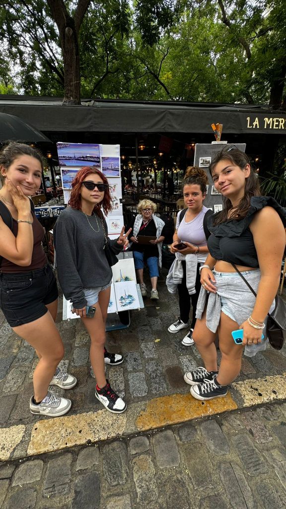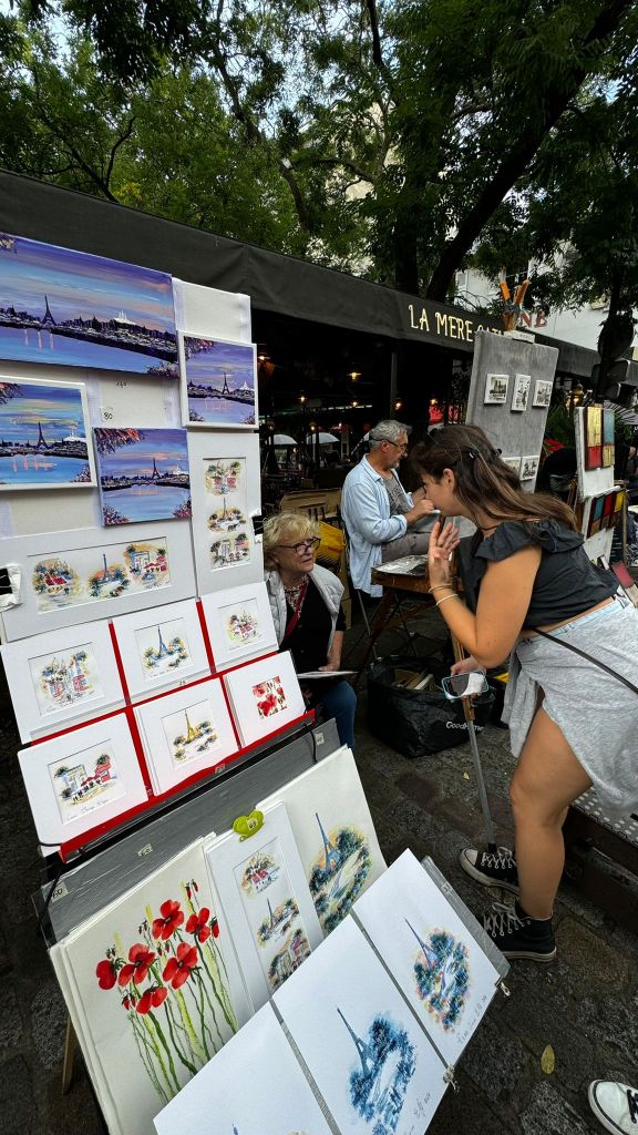 Sveglia puntuale e solita colazione in ostello, poi pronte con gli zaini in spalla alla scoperta di Parigi, la città della luce. Come prima tappa abbiamo deciso di scendere al quartiere Montmartre fino ad arrivare alla Basilique du Sacrè-Coeur attraverso la funicolare che porta fino alla basilica. Dopo averla vista al suo interno, ci siamo perse per i vicoletti dove si possono osservare vari artisti che dipingono sul momento, Silvia molto incuriosita poiché ha una grande passione per la pittura, ha conosciuto Susanne, una delle artiste di strada, una signora molto gentile, che ha augurato a Silvia di continuare a fare ciò che le piace di più, pittura compresa.