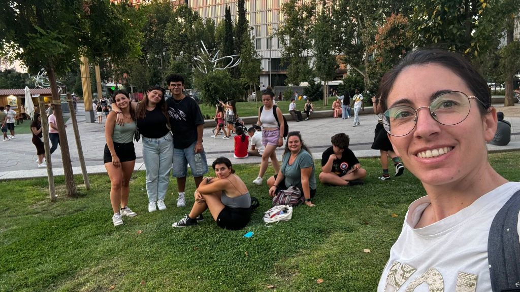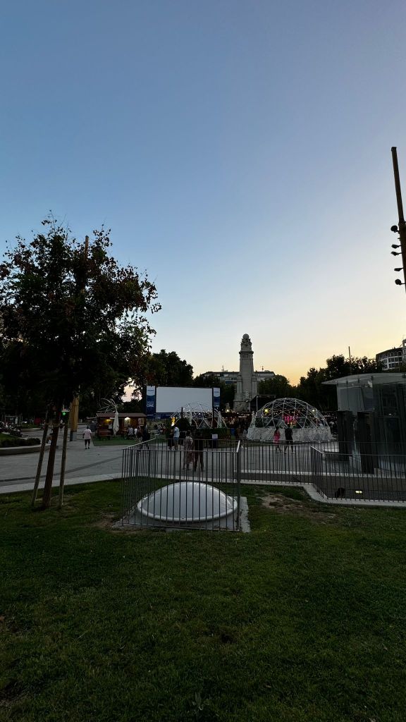 Arrivate sulla Gran Via, abbiamo incontrato e conosciuto Amira, un’amica di Diana che vive a Madrid, insieme al suo compagno Gabriel. Abbiamo passeggiato tutti insieme fino a Plaza de España dialogando un po’ in italiano, inglese e spagnolo!! Una volta arrivati ci siamo accomodati sul prato, per scambiarci racconti, idee ed impressioni del viaggio. … ci ha racconto che Plaza de España viene allestita diversamente in base alla stagione, durante l’inverno ospita mercatini tipici, mentre l’estate offre la visione di film attraverso il cinema all’aperto.